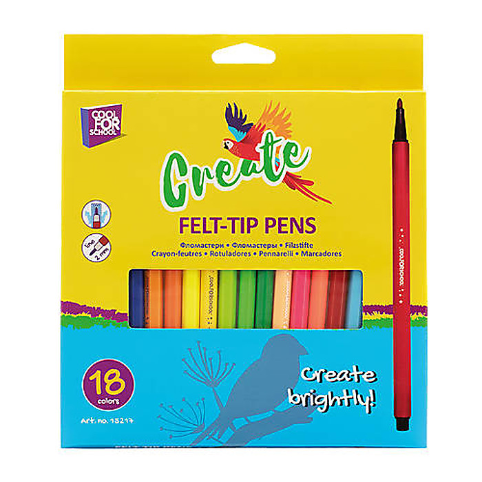 Товщина лінії письма – 1-2 мм. Матеріал корпусу: поліпропілен (більш гнучкий вид пластику). Корпус: шестигранний, оснащений вентильованим ковпачком. Яскраві насичені кольори. Чорнила на водній основі.