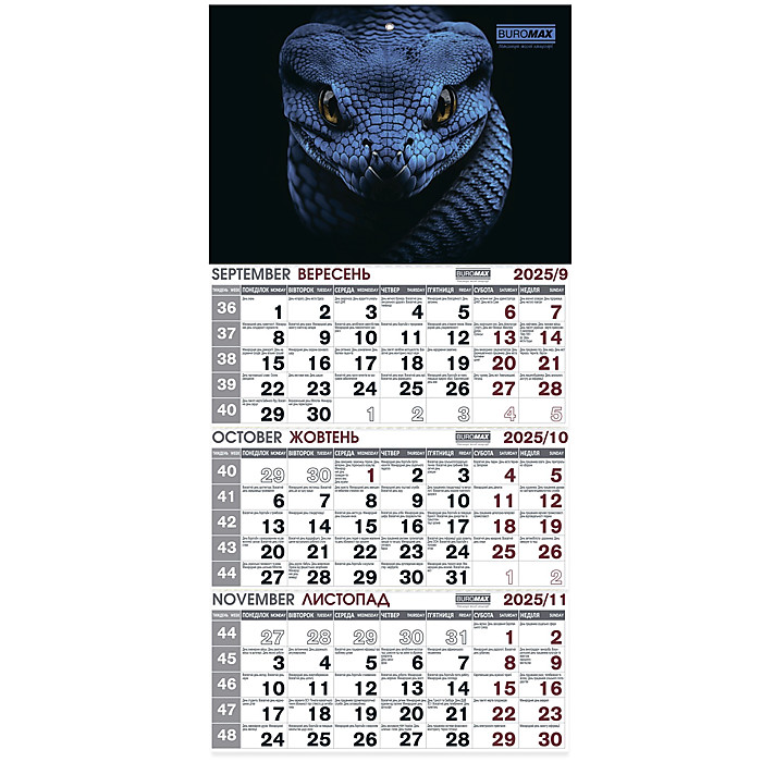 Календар BUROMAX на 2026 рік – незамінна річ, яка допоможе Вам легко спланувати свій місяць, квартал і рік.;Зручний настінний квартальний календар на 3-х пружинах;Три блоки, на кожному блоці один місяць, по 12 аркушів у кожному блоці;Розмір виробу: 298х648мм;Розмір постера: 298х210мм, виготовлений з целюлозного картону 300 г/м?;Розмір блоків: 298х140мм, виготовлені з крейдованого паперу 90 г/м?;Календарна сітка двома мовами: українською, англійською;Комплектується покажчиком дати і отвором для кріплення ;Додаткова інформація: церковні, державні та професійні свята, вихідні дні