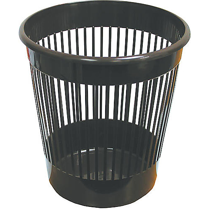 Кошик для сміття об’ємом 10 літрів виготовлений з поліпропілену чорного кольору. Корпус розширюється догори, кошик для сміття має перфорації.