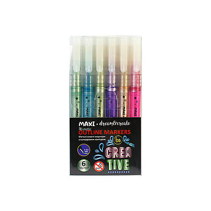 Металізовані двоколірні маркери на спиртовій основі, товщина лінії письма 1-2,5 мм.Для декоративних робіт на папері, картоні, пластику та інших непористих поверхнях.При нанесенні маркери залишають сріблястий слід, навколо якого проявляється кольоровий металізований відтінок.