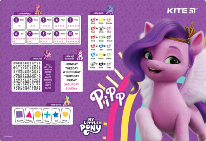 Настільна пластикова підкладка використовується для творчості: малювання фарбами і олівцями, ліплення пластиліном, роботи з клеєм і папером. Також підкладку можна використовувати під столові прилади. Корисний інформаційний блок допоможе вивчити кольори, геометричні фігури, цифри та дні тижня англійською мовою. Підкладка досить щільна (500 мкм), що дозволяє вберегти поверхню стола від подряпин. На підкладці зображений улюблений персонаж дівчаток Май Літл Поні. Рекомендовано дітям дошкільного та шкільного віку.