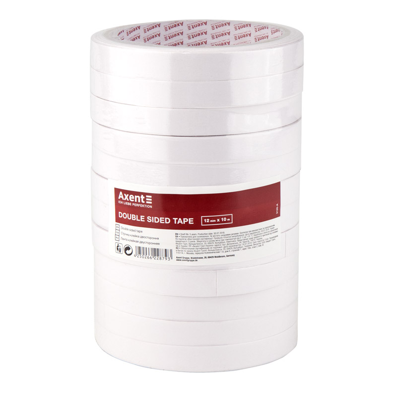 Двостороння клейка стрічка відрізняється наявністю клейкої речовини на обох сторонах основи. Із зовнішнього боку має спеціальну захисну плівку; яка не дозволяє шарам склеюватися між собою. Стрічка клейка двостороння Axent прозора; має білу паперову основу. Якісний склад клею забезпечує міцне і надійне кріплення поверхонь на тривалий термін. Підходить для використання в офісі; для художньо-оформлювальних робіт або для вирішення дрібних побутових завдань.