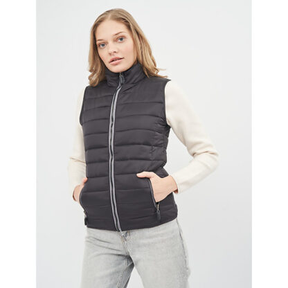 Стильний жіночий жилет з глянцевого поліестеру; запезпечує чудові теплоізоляційні властивості, маючи абсолютно незначну вагу; 2 бокові кишені з контрасною застібкою-блискавкою; контрасна блискавка; матеріа верху та підклатки – 100 % поліестер.