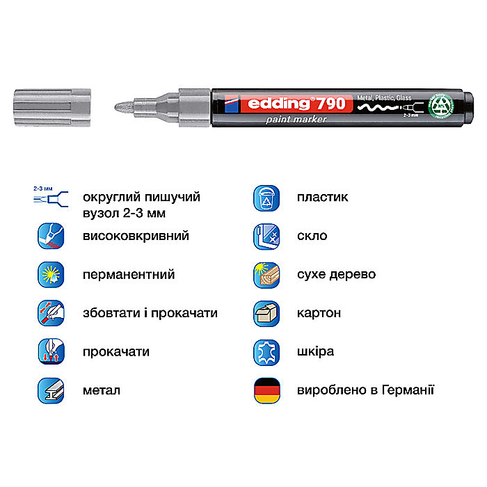 Лаковий маркер edding 790 забезпечує чітке, стійке маркування навіть на темних поверхнях. Завдяки густим чорнилам з високою покривною здатністю та округлому наконечнику (2–3 мм), він підходить для точного нанесення. Пише на таких матеріалах, як: метал, пластик, скло, суха деревина, картон, шкіра, лаковані поверхні. Маркер забезпечує довговічне та помітне покриття при використанні як в приміщеннях, так і на вулиці. Слід маркеру є волого-, зносо- , світло- та термостійким. Завдяки якісним чорнилам на спиртовій основі, слід маркеру швидко висихає та не розмазується. Ідеальний для виробництв, майстернь та побутових задач. Чорнила практично не мають запаху, не містять толуолу та ксилолу Виготовлений в Німеччині.