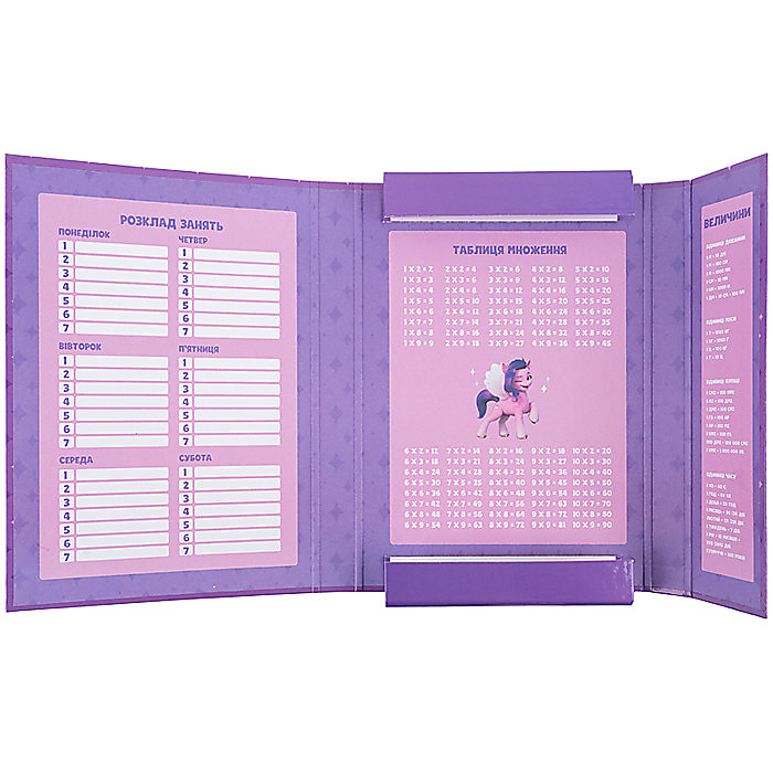 Щоб важливі речі завжди були перед очима, всередині є поле для розкладу, табличка множення та список величин.