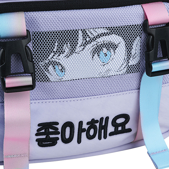 - декор: поліестер з жатим ефектом, градієнтний друк на тасьмі, об’ємна вишивка, об’ємний друк, декоративна вставка-сітка, брелок-підвіска з паракорду, брелок-підвіска у формі квітки на металевому карабіні.