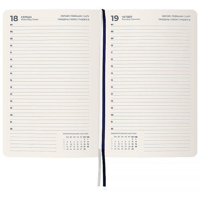 Дві різнокольорові закладки-ляссе дозволяють швидко знайти та відкрити потрібні сторінки. Містить 168 аркушів, розмір – 145*210 мм. Кишені на форзаці немає. Немає тасьми на обкладинці та петлі для ручки.