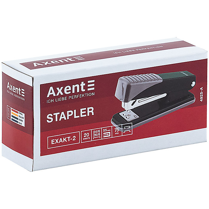 Степлер Axent Exakt-2 4925-29-A Earth colors виготовлений повністю з металу. Пластикова вставка зверху на рукоятці забезпечує ергономічність у використанні. Можливість зміни способу скріплення з закритого на відкритий – натисненням кнопки на підошві степлера. Віконце контролю наявності скоби. Прогумована підошва.